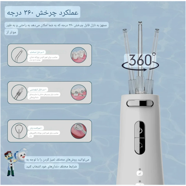 نازل رابچرخانید تا جهت خروج آب را طوری تنظیم کنید که عمود بر قسمتی ازدهان شما باشد که می خواهید تمیز کنید.