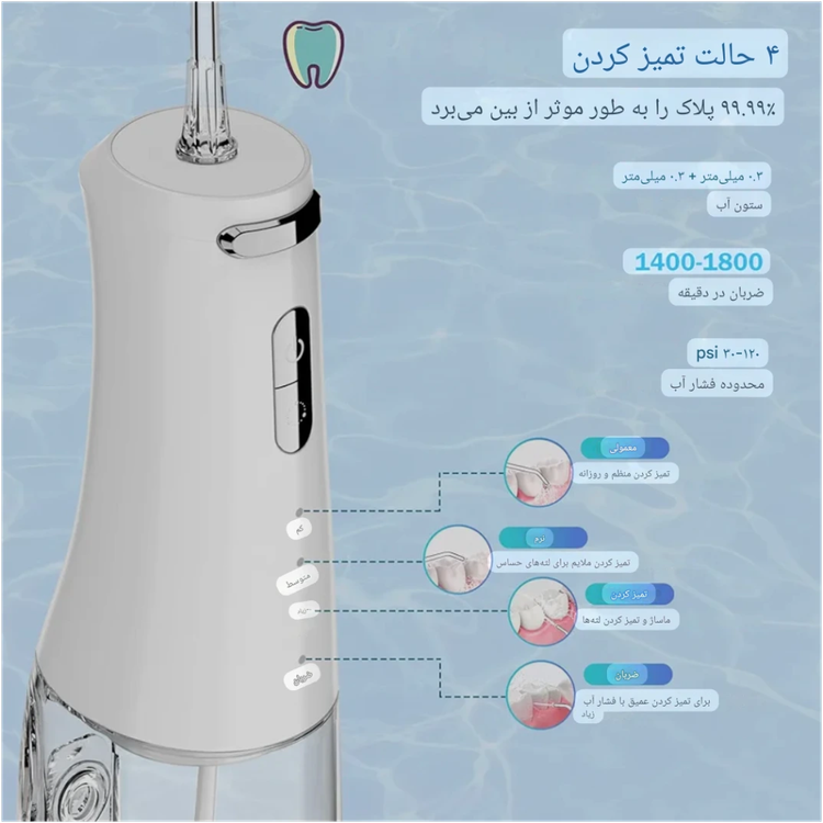 این دستگاه با نام های واتر فلوسر ، واتر پیک ،جرم گیر دهان و دندان ، دهان شوی برقی شناخته میشود.عملکرد این دستگاه شست و شوی دهان از طریق پاشش آب به لثه و دندان ها میباشد.