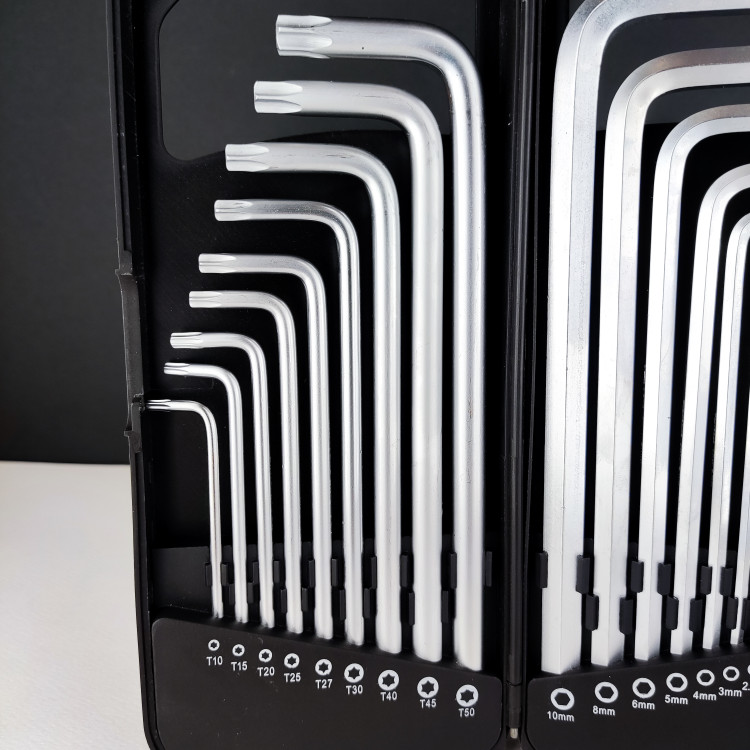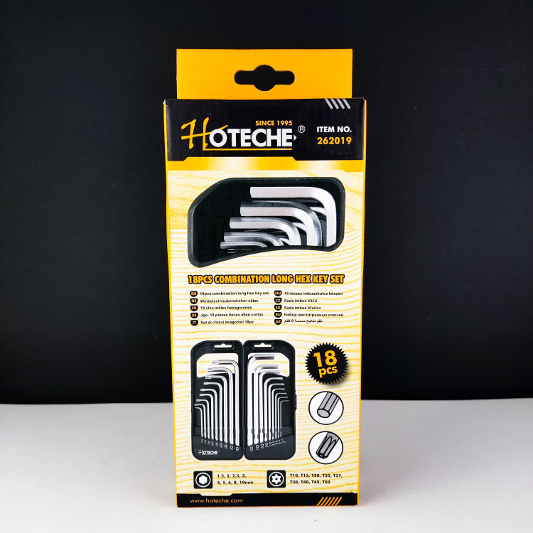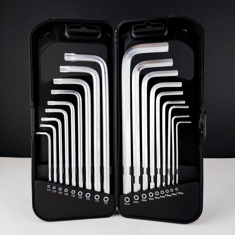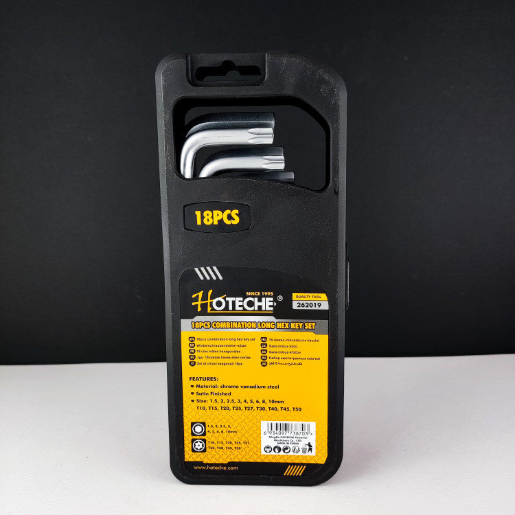 مجموعه 18 عددی آچار ستاره و آچار شش گوش دسته بلند جنس:Cr-V شامل : 9 عدد آچار شش گوش یا ال از سایز 1.5 تا 10 میلی متری 9 عدد آچار ستاره گوش یا تی شکل از سایز T10 تا T50